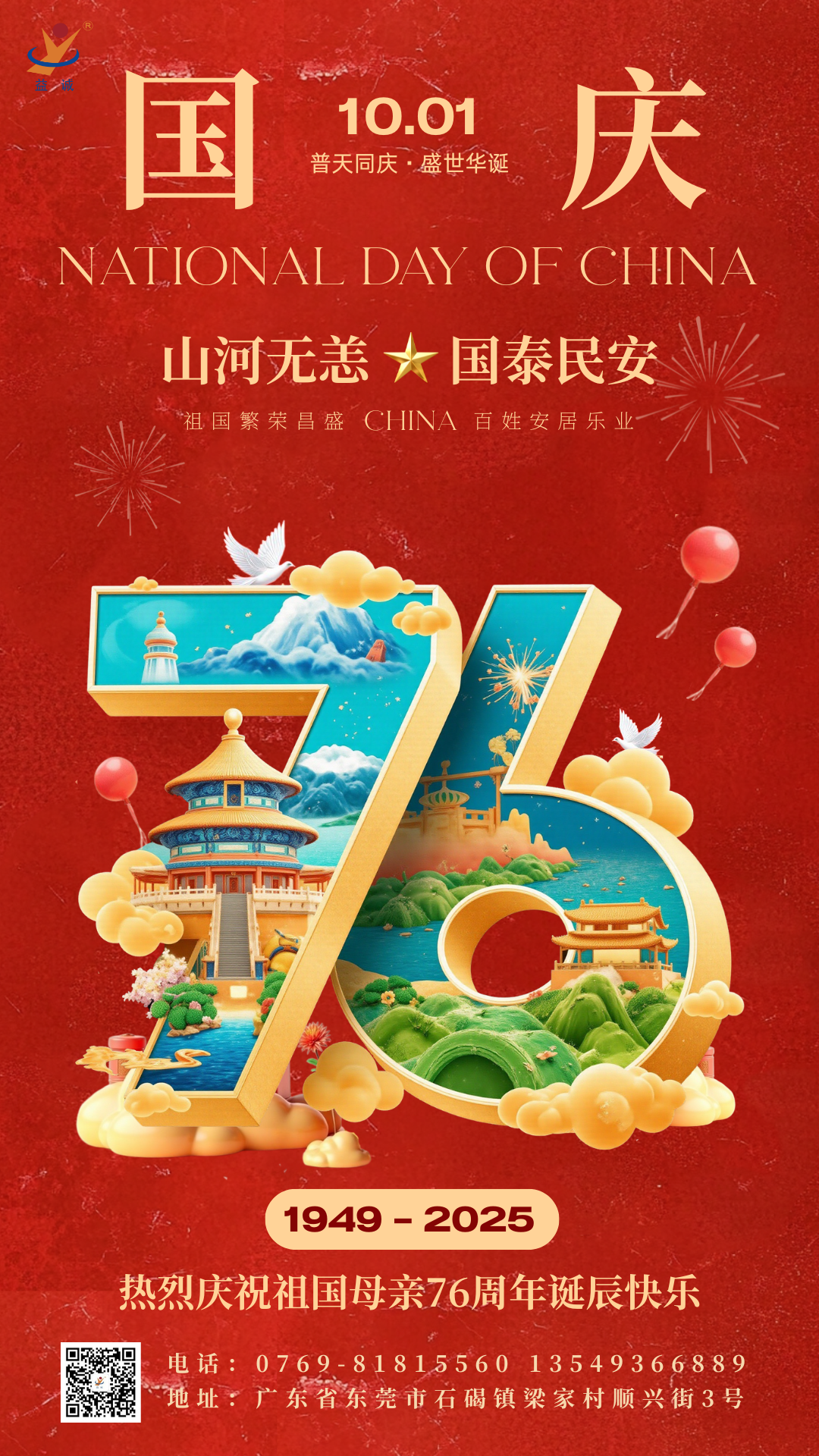 普天同慶,盛世華誕!益誠(chéng)自動(dòng)化祝祖國(guó)母親76周年生日快樂(lè)!