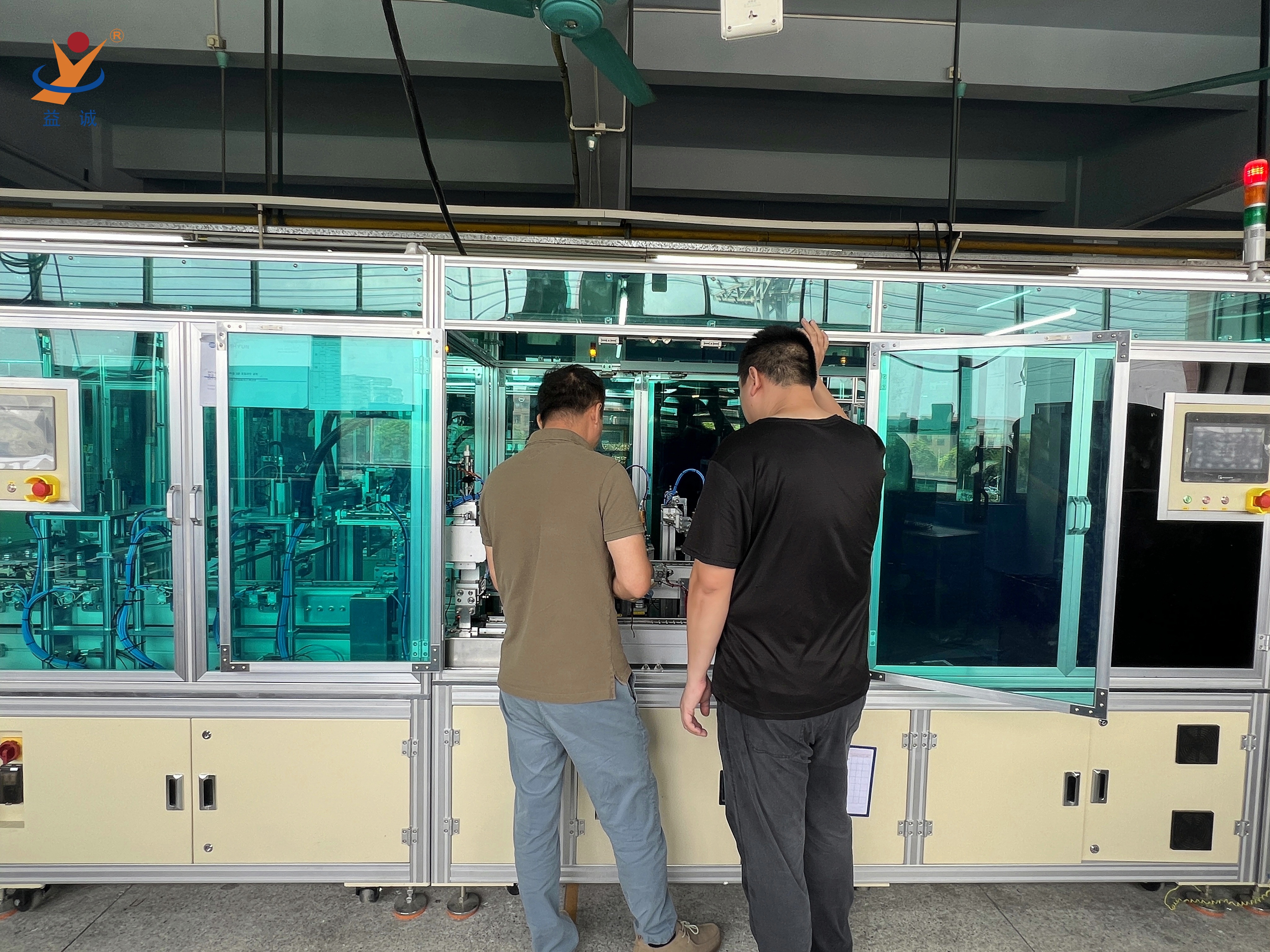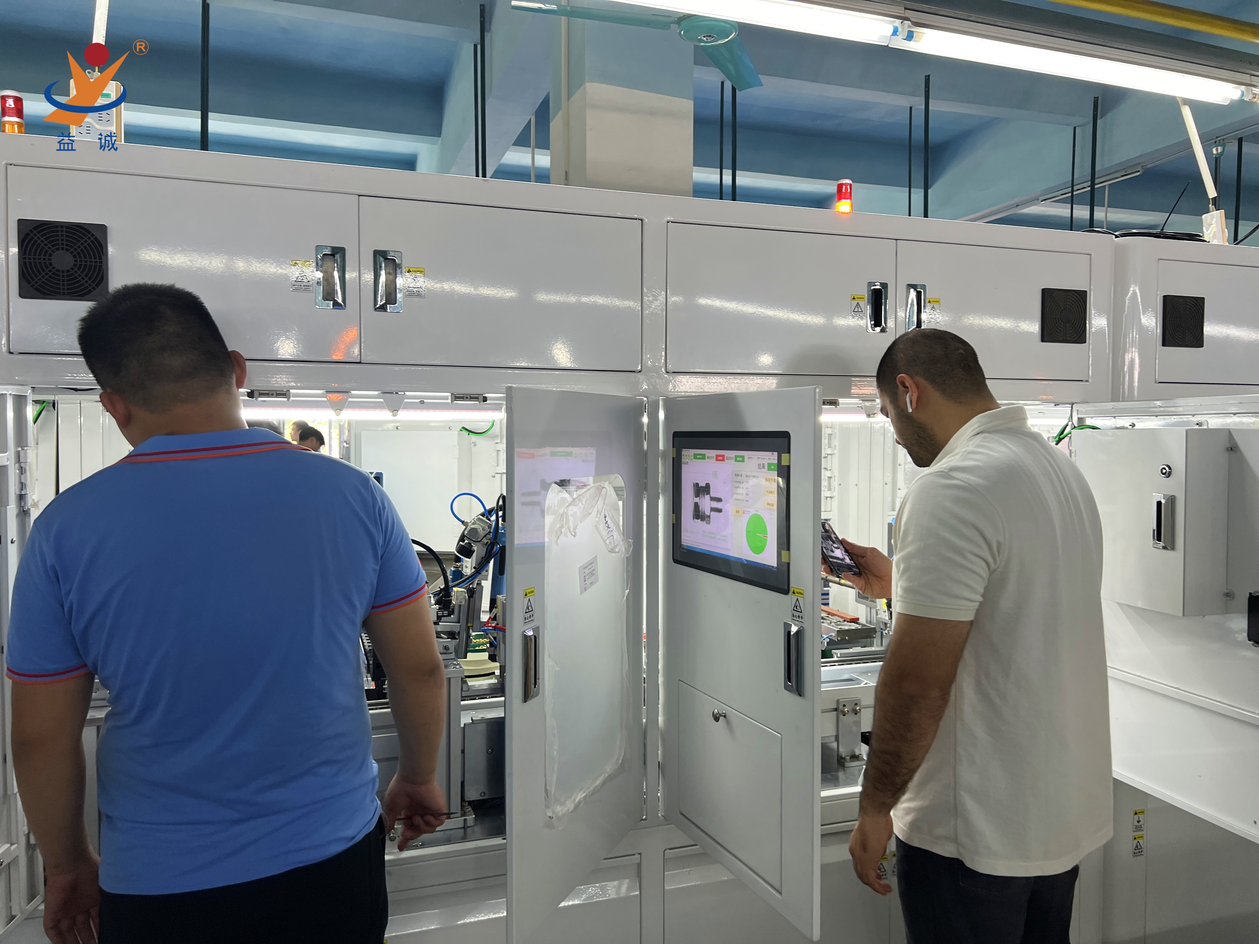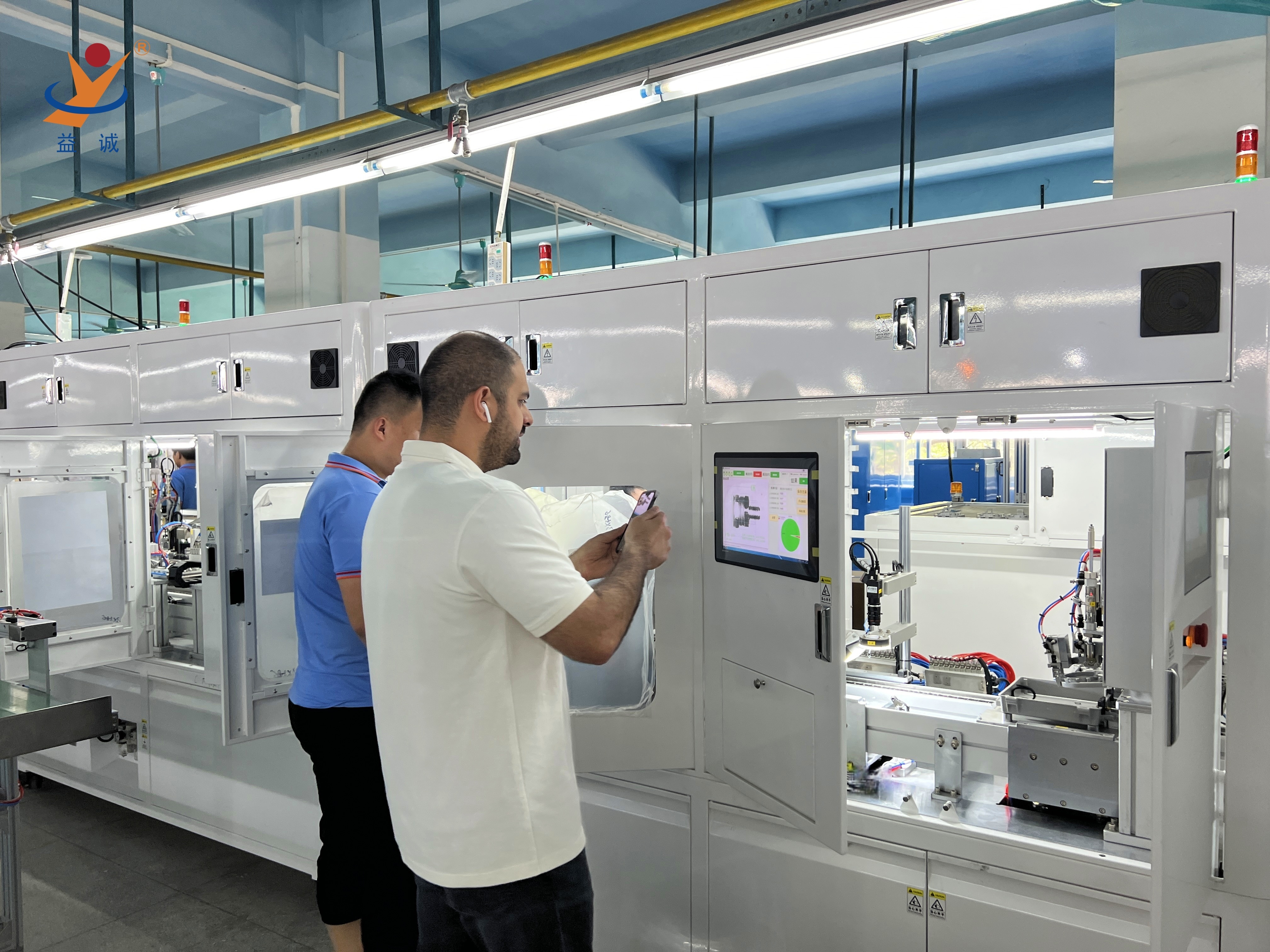 來自美國的客戶團隊是益誠的資深優(yōu)質(zhì)合作伙伴,目前正在對一條高端智能網(wǎng)絡(luò)設(shè)備自動化生產(chǎn)線進行驗收,該條高智能、高科技的全自動化生產(chǎn)線由益誠結(jié)合客戶深度需求研制。